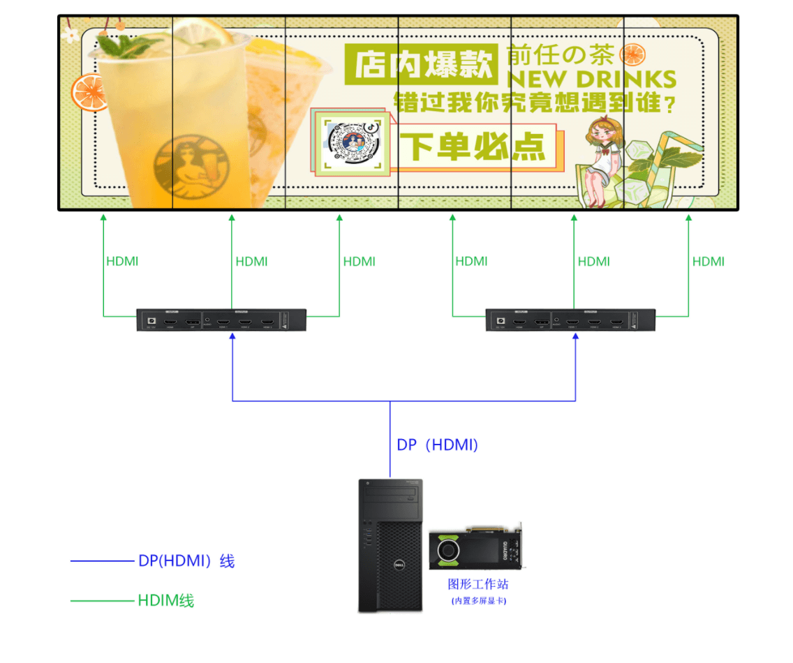 多屏宝作为一种超高性价比的多屏扩展设备,其结合NVIDA、AMD等专业图形卡,根据显示屏数量及分辨率等比 例拼接显示,可以实现1×3、1×4、1×5、1×N等长条形拼接模式,点对点显示,不变形,不拉伸,可广泛应用于展览展厅、餐饮服装珠宝连锁店、广告墙显示、LCD/LED拼接屏等。