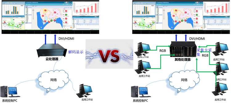 VDesk云处理系统,是一款具备综合数字信号处理能力的拼接处理器系统,利用图像并行处理显示技术,可支持IP信号直接解码显示,可以将用户应用工作站同时运行的多个应用窗口,编码成对应多个独立的IP码流信号,通过网络接入云处理系统直接解码显示。